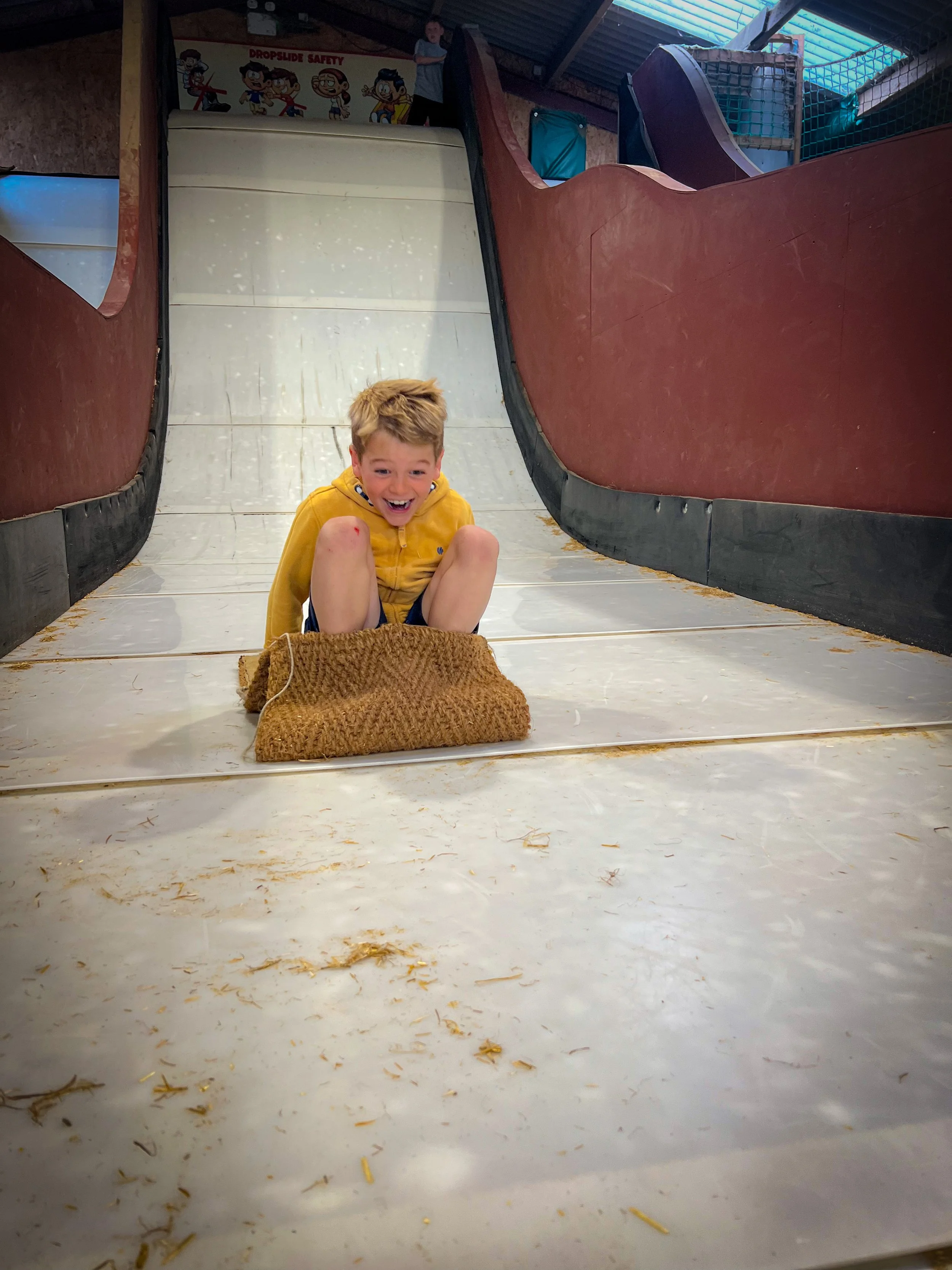Sliding down one of the big slides at Billy Bobs near Skipton
